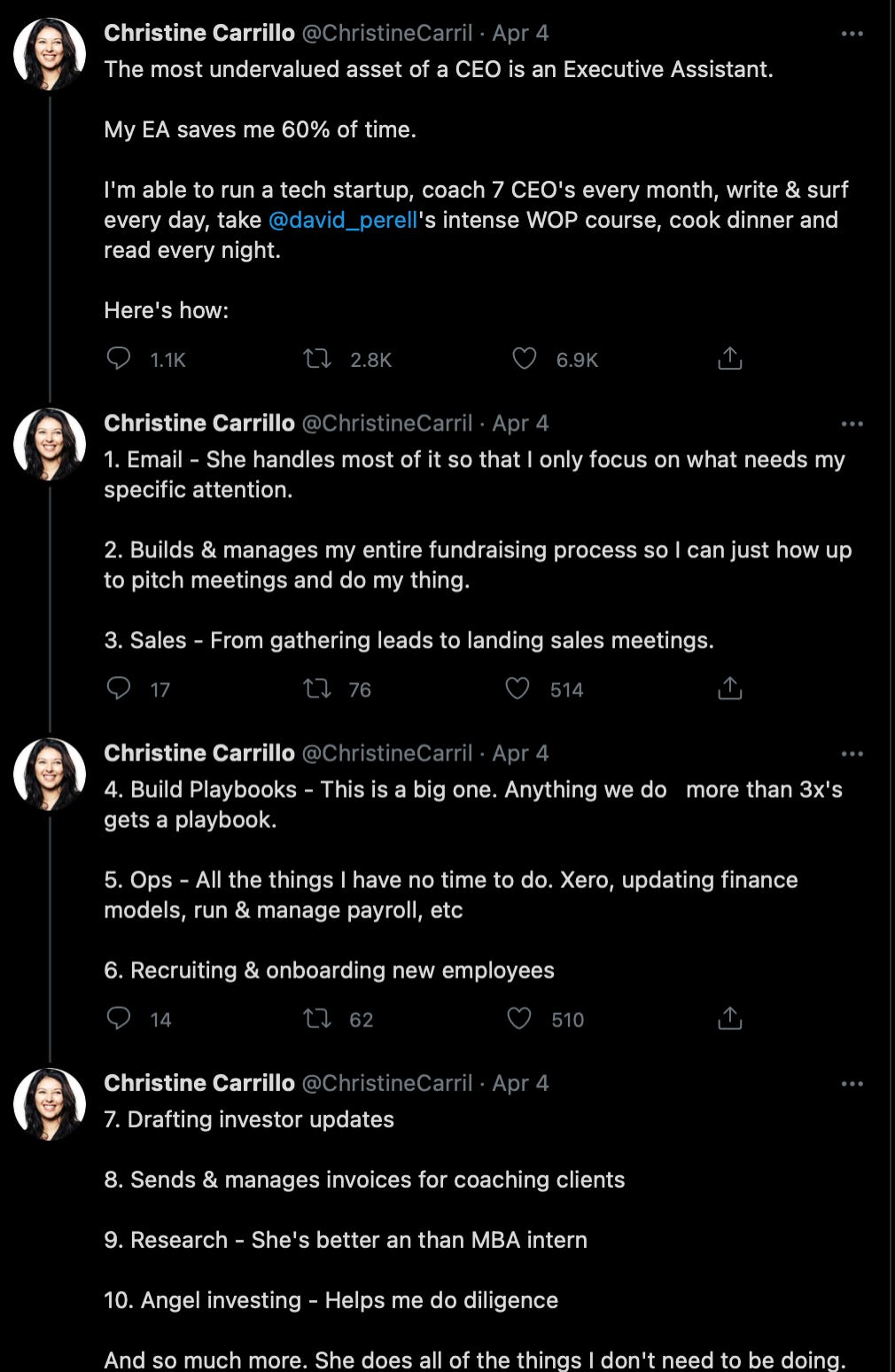 "If the EA is not performing, our CEO won't be able to attend her private windsurfing lessons, do transcendental meditation after lunch, or write her weekly company leadership Substack. That mental capacity isn't going to free itself."